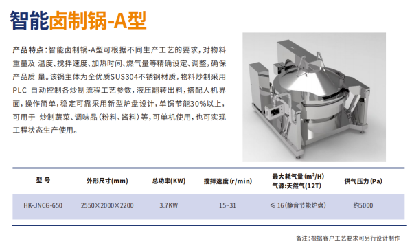 主要⽤于⾁制品等固状产品的煮制或⻧制,整机程序化控制,进料后⽆需员⼯操作,⼤⼤减少员⼯劳动强度等,⾃动控温、⾃动控时、⾃动搅拌、⾃动翻锅。